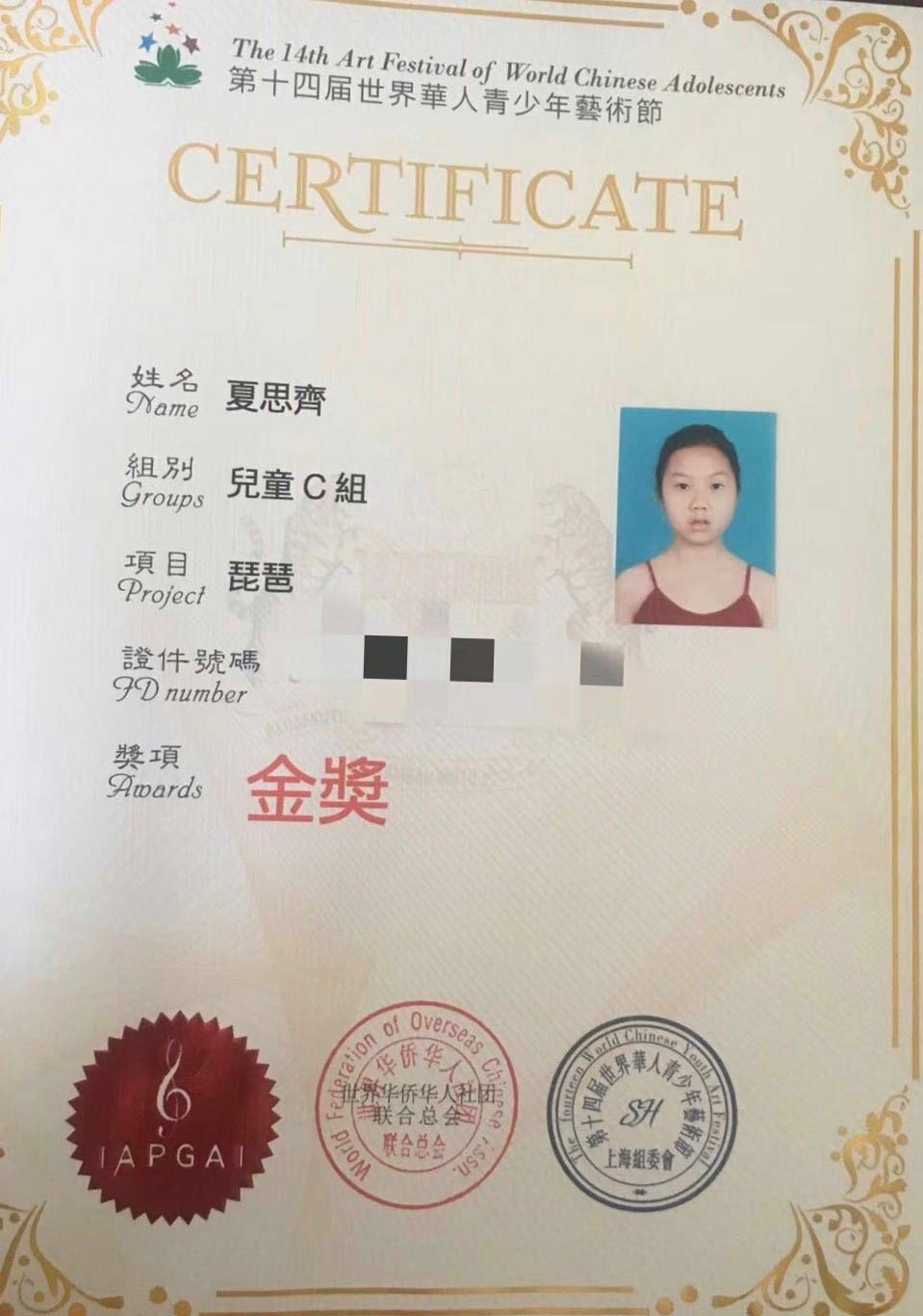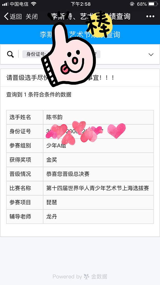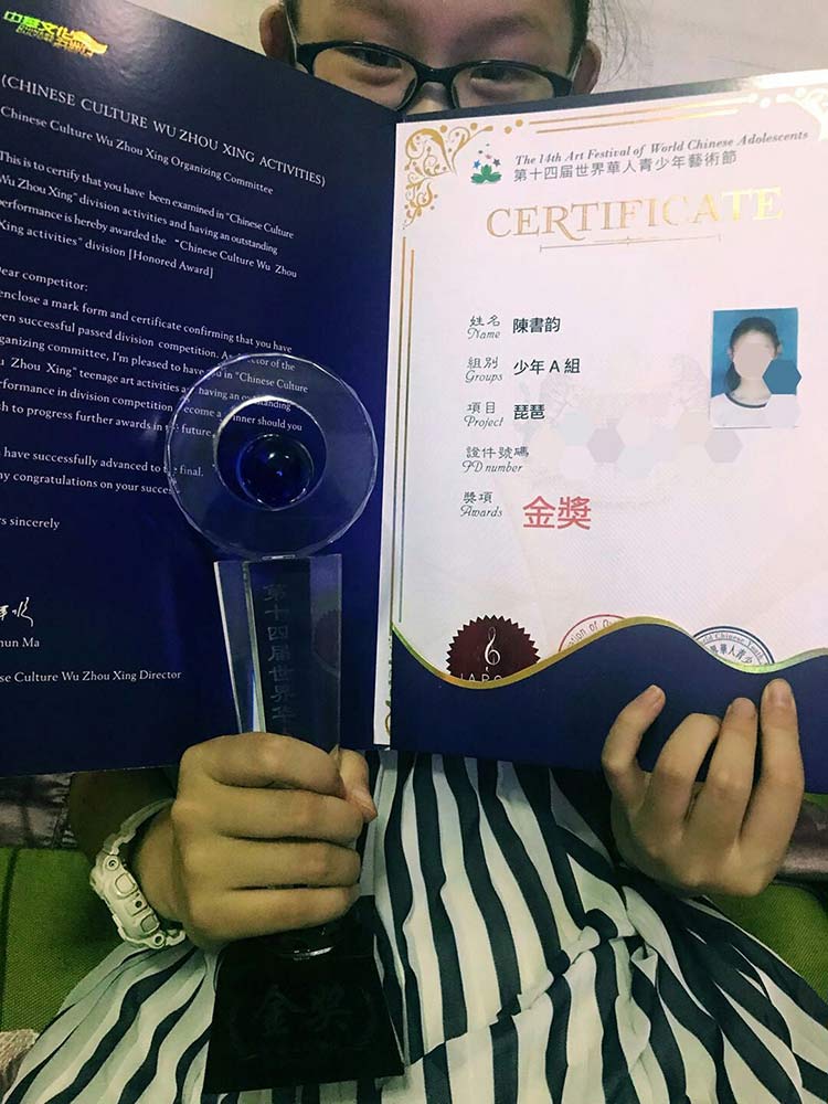 龍丹老師的琵琶學(xué)員夏思齊、陳書(shū)韻及馬瑩瑩老師的鋼琴學(xué)員杜思衡,楊知蓁老師的古箏學(xué)員俞欣妤均獲得了金獎,晉級成功征站總決賽!